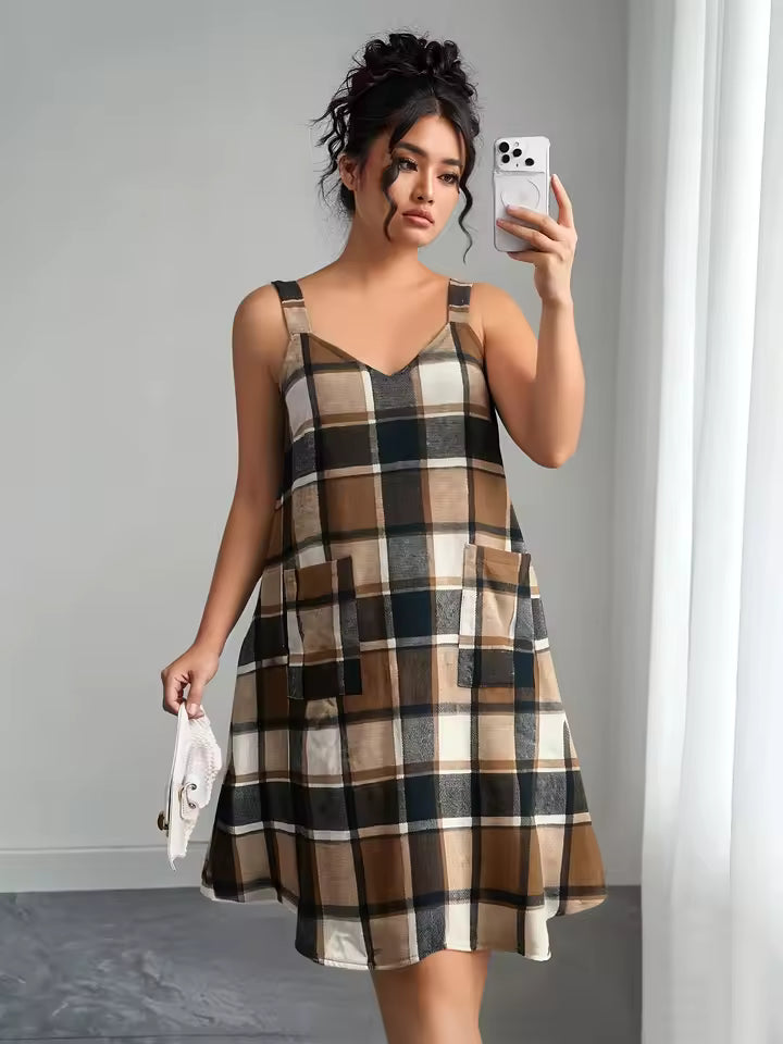 Robe Élégante Automne–Hiver à Carreaux, Col V et Coupe Halter