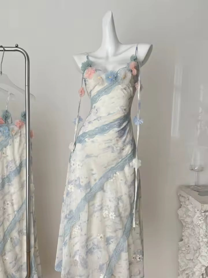 L’imprimé floral ajoute une touche fraîche et romantique, renforçant l’esthétique féérique et estivale de la robe.