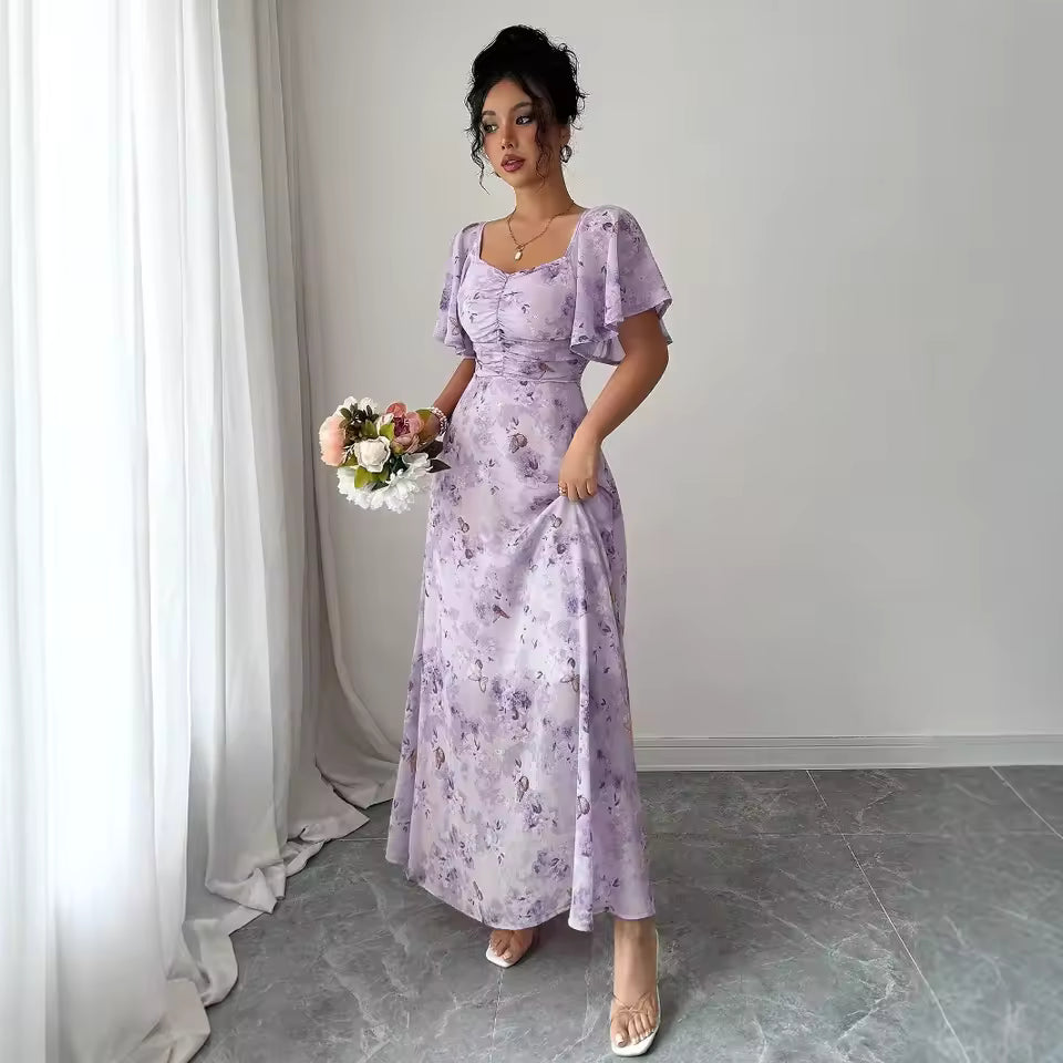 Adorned with a floral print, the dress offers a fresh and graceful look. The pattern adds charm and movement, perfect for summer outings and casual gatherings.