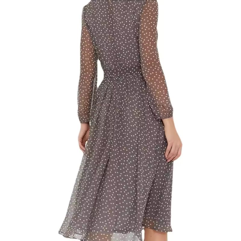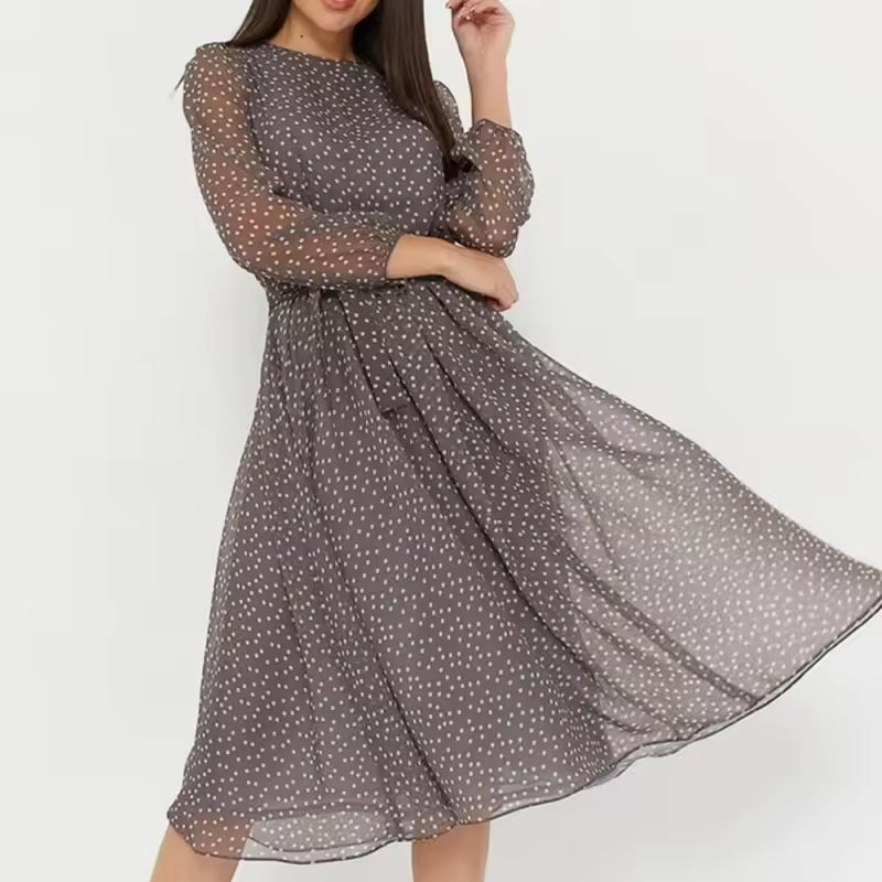 Inspirée de la mode rétro, cette robe en chiffon à pois apporte une touche élégante et féminine, parfaite pour les amoureuses du style classique revisité.